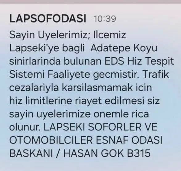 ​Lapseki Şoförler ve Otomobilciler Esnaf Odası, Adatepe mevkiinde faaliyete geçen Elektronik Denetleme Sistemi (EDS) ve artan radar denetimleri konusunda üyelerini ve tüm sürücüleri uyardı.