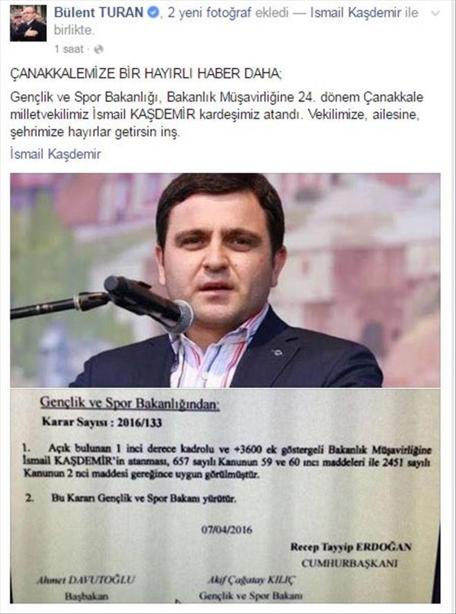 Görevlendirme yazısını Ak Parti Grup Başkanvekili Av.Bülent Turan sosyal medya hesabı üzerinden duyurdu. Ak Parti Grup Başkanvekili Av.Bülent Turan, kişisel sosyal medya hesabı ?Facebook´ üzerinden gerçekleştirdiği paylaşımda, 24. Dönem Ak Parti Çanakkale Milletvekili İsmail Kaşdemir´in Gençlik ve Spor Bakanlığı, Bakanlık Müşavirliğine atandığına ilişkin karar yazısını paylaşarak ?´Gençlik ve Spor Bakanlığı, Bakanlık Müşavirliğine 24. dönem Çanakkale milletvekilimiz İsmail KAŞDEMİR kardeşimiz atandı. Vekilimize, ailesine, şehrimize hayırlar getirsin inşallah´´ ifadelerine yer verdi.