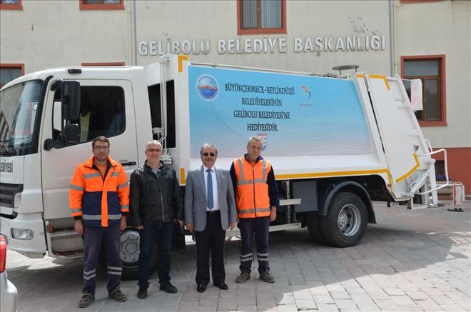Mevkidaşları ile sıcak ilişkilerini sürdüren Gelibolu Belediye Başkanı Mimar M.Mustafa Özacar´a, İstanbul´un iki başarılı başkanı Büyükçekmece Belediye Başkanı Dr.Hasan Akgün ve Beylikdüzü Belediye Başkanı Ekrem İmamoğlu jest yaparak Gelibolu Belediyesi´ne bir adet çöp kamyonu hibe ettiler.