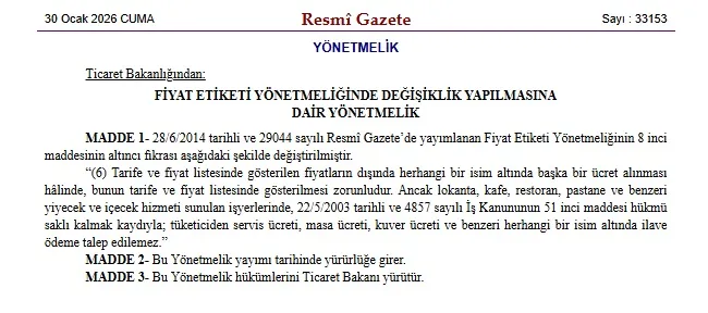 30 Ocak 2026 itibarıyla Türkiye genelindeki tüm yiyecek ve içecek işletmelerini kapsayan devrim niteliğinde bir düzenleme yürürlüğe girdi.