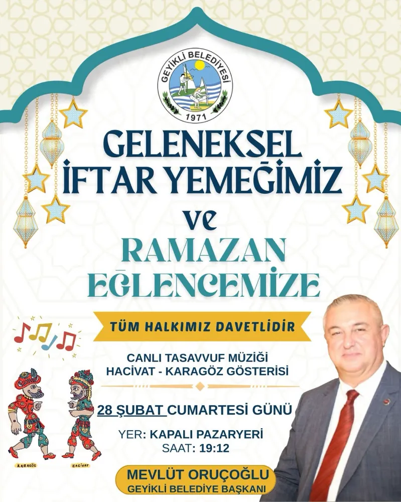 Geyikli Belediyesi tarafından düzenlenen "Geleneksel İftar Sofrası ve Ramazan Eğlenceleri", 28 Şubat akşamı tüm belde halkını ve misafirleri bir araya getirecek.