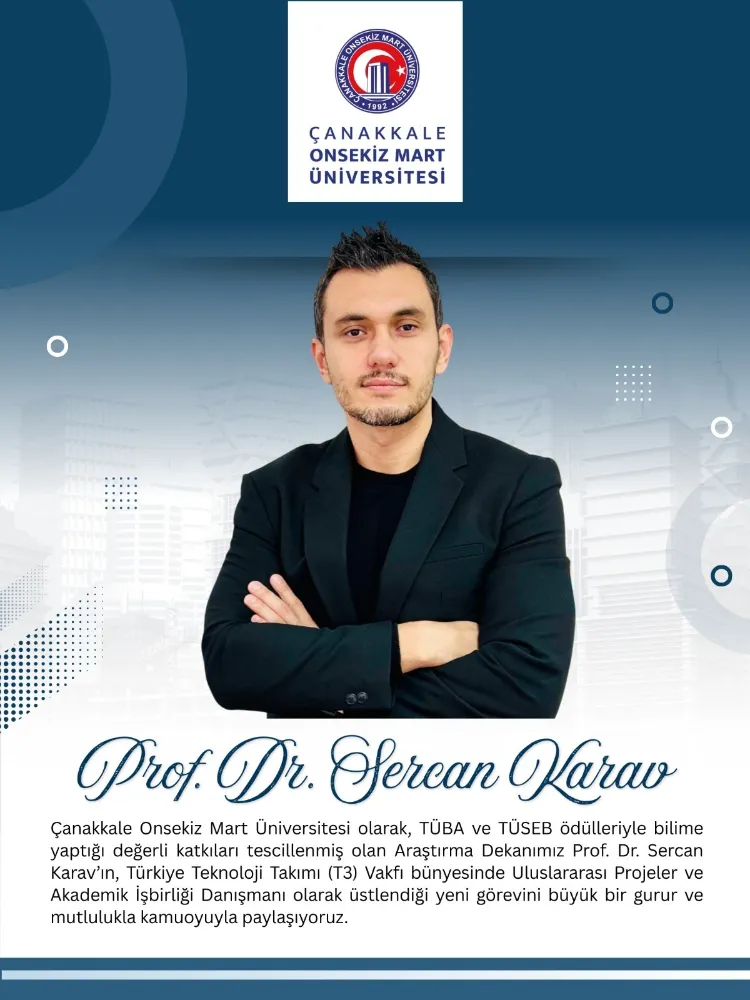 Çanakkale Onsekiz Mart Üniversitesi (ÇOMÜ) Araştırma Dekanı, TÜBA ve TÜSEB ödülleriyle bilimsel alandaki katkıları tescillenmiş olan Prof. Dr. Sercan Karav, Türkiye Teknoloji Takımı (T3) Vakfı bünyesinde Uluslararası Projeler ve Akademik İşbirliği Danışmanı olarak görevlendirildi. Bilimsel üretkenliği, ulusal ve uluslararası düzeyde güçlü akademik ağı, yenilikçi vizyonu ve gençlere ilham veren çalışmalarıyla ÇOMÜ’nün araştırma ekosistemine önemli katkılar sunan Prof. Dr. Karav’ın üstlendiği bu yeni görev; Türkiye’nin bilim, teknoloji ve yenilik alanındaki stratejik hedeflerine katkılar sağlayacaktır. ÇOMÜ Rektörü Prof. Dr. R. Cüneyt Erenoğlu, bilgi üretimini somut çıktılara dönüştüren, ulusal kalkınmayı destekleyen ve sürdürülebilir değer oluşturan akademik yaklaşımıyla öne çıkan Prof. Dr. Karav’ın bu görevinin, ÇOMÜ’deki genç araştırmacılar ve öğrenciler için de önemli bir motivasyon kaynağı olacağının altını çizerek; “ÇOMÜ ailesi olarak; bilimin, araştırmanın ve yenilikçi düşüncenin dönüştürücü gücüne inanan tüm gençlerimize, Prof. Dr. Sercan Karav’ın başarı hikâyesini ilham verici bir örnek olarak görmelerini tavsiye ediyor; üniversitemizi ve ülkemizi gururla temsil eden Prof. Dr. Sercan Karav’ı tebrik ediyor, yeni görevinde başarılarının artarak devam etmesini diliyoruz” dedi.