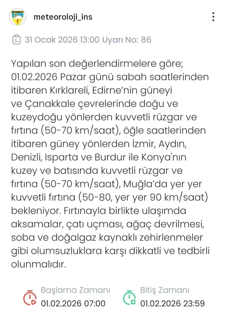 Genel Müdürlükten yapılan açıklamada bölgede doğu ve kuzey doğu yönlerden kuvvetli rüzgar ve fırtına beklediği kaydedidi. Yapılan açıklamada şu sözlere yer verildi; “ 1 Şubat günü sabah saatlerinden itibaren Çanakkale çevresinde doğu ve kuzeydoğu yönlerden kuvvetli rüzgar ve fırtına bekleniyor. Fırtınayla birlikte ulaşımda aksamalar, çatı uçması, ağaç devrilmesi, soba ve doğalgaz kaynaklı zehirlenmeler gibi olumsuzluklara karşı dikkatli ve tedbirli olunmalıdır” denildi.