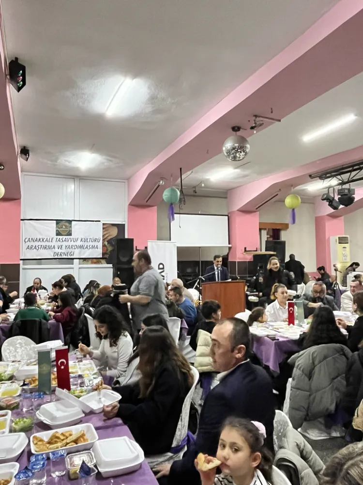 Programda konuşan Çanakkale Tasavvuf Kültürü Araştırma ve Yardımlaşma Derneği Başkanı Şakir Barca toplumsal dayanışmanın önemine dikkat çekilerek şu ifadelere yer verdl; " Bugün burada sadece bedenen acıktığımız için değil, ruhlarımızı doyurmak, gönül köprülerimizi güçlendirmek için bir araya geldik. Bizim yolumuz; Mevlana’nın "Gel!" çağrısıyla genişleyen, Şems’in aşk ateşiyle pişen ve Yunus’un arı duru Türkçesiyle "Sevelim, sevilelim" diyen bir gönül yoludur. Bu akşam soframızda üç büyük mana erinin bereketini taşıyoruz: Hz. Mevlana gibi; bir ayağımız şeriatın merkezinde sabit, diğer ayağımızla yetmiş iki milleti kucaklıyoruz. Onun dediği gibi; "Bir mum, diğer mumu tutuşturmakla ışığından bir şey kaybetmez." Biz de bu akşam sevgimizi paylaşarak çoğaltıyoruz. Şems-i Tebrizi’nin o sarsıcı hakikatini hatırlıyoruz: "Hakk’a giden yol yürekten geçer, akıldan değil." Bu iftar saati, aklın susup gönlün konuştuğu, maskelerin düştüğü ve sadece "kul" olduğumuz o eşsiz andır. Bizim Yunus’un sesi kulaklarımızda: "Ben gelmedim dava için, benim işim sevi için." Biz de buraya dava gütmeye değil, birbirimizin gönlünde taht kurmaya geldik. Ramazan, bir "ben"den vazgeçip "biz" olma sanatıdır. Soframızdaki ekmek bölünerek azalır ama paylaşılan dua ve kardeşlik bölünerek artar. Rabbim tuttuğunuz oruçları, ettiğiniz duaları, Mevlana’nın aşkıyla, Şems’in sadakatiyle ve Yunus’un teslimiyetiyle kabul eylesin. Soframız bereketli, gönlümüz huzurlu, birliğimiz daim olsun" dedi. İftar programına İl Milli Eğitim Müdürü Mine Hayta ve çok sayıda davetli katıldı.