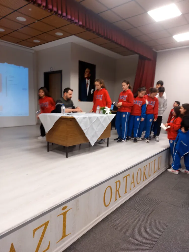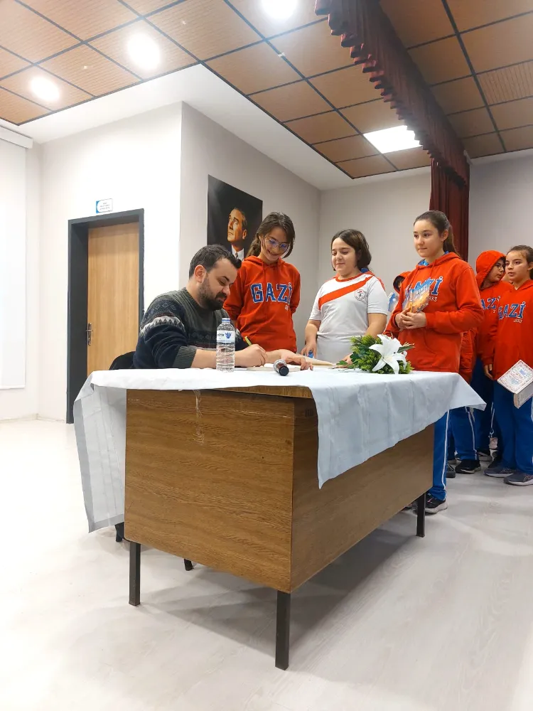 Öğrencilere kitap okuma alışkanlığı ve yaratıcı yazma alışkanlığı kazandırmak, okuduğunu anlama ve düşünme becerilerini geliştirme, kütüphaneleri keşfetme ve onlardan yararlanma potansiyellerini arttırmak amacıyla Gazi Ortaokulunda yazar buluşması etkinliği düzenlendi. Düzenlenen etkinlikte Yazar Özgür Balpınar öğrenciler ile bir araya geldi. Okul konferans salonunda düzenlenen Yazar Buluşmasına; okul müdürü Muhammed Yılmaz, Okul Türkçe öğretmenleri ve öğrenciler katıldı. Yazar Buluşması’nda ilk olarak Türkçe Öğretmeni Serap Erez etkinlik hakkında bilgilendirmede bulundu. Konuşmanın ardından Yazar Özgür Balpınar öğrencilerle bir araya gelip söyleşi verdi. Söyleşinin sonunda öğrencilerin kitaplarını imzalayan Yazar Özgür Balpınar, etkinliği düzenleyenlere teşekkür etti.